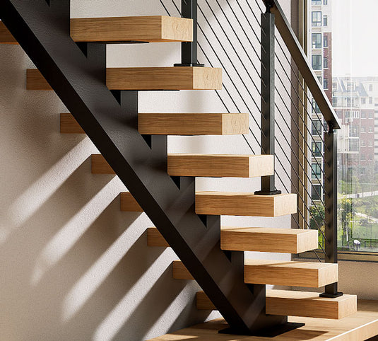The Muzata stair project engineering team has over 10 years of experience and is well-versed in all regulatory requirements. They are capable of designing and manufacturing floating staircases that comply with building codes. When equipped with cable railings or glass railings, a floating staircase is completely safe. Muzata's custom staircases can be tailored to your needs, and by informing us of local regulatory requirements ahead of time, you need not worry about the safety of your floating staircase.